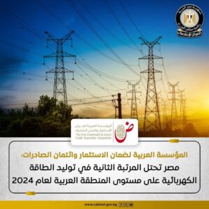 احتلت مصر مركزًا متقدمًا من حيث إجمالي توليد الطاقة الكهربائية في المنطقة العربية، وفقًا لتقرير المؤسسة العربية لضمان الاستثمار وائتمان الصادرات، حيث بلغ إجمالي الطاقة المُولَّدة خلال عام 2024 نحو 207 تيراوات/ساعة، مع تقديرات بارتفاعها إلى حوالي 214 تيراوات/ساعة بنهاية عام 2025، ووصولها بحلول عام 2030 إلى نحو 259 تيراوات/ساعة، وذلك وفقًا للتقرير. وتحقق هذا النمو بفضل مشروعات ضخمة، أبرزها مشروعات الطاقة المتجددة، والتي منها محطة الزعفرانة لطاقة الرياح، ومجمع بنبان للطاقة الشمسية، ومحطات جبل الزيت لطاقة الرياح، وغيرها، مما يعزز جهود الدولة لتلبية الطلب المحلي على الكهرباء.