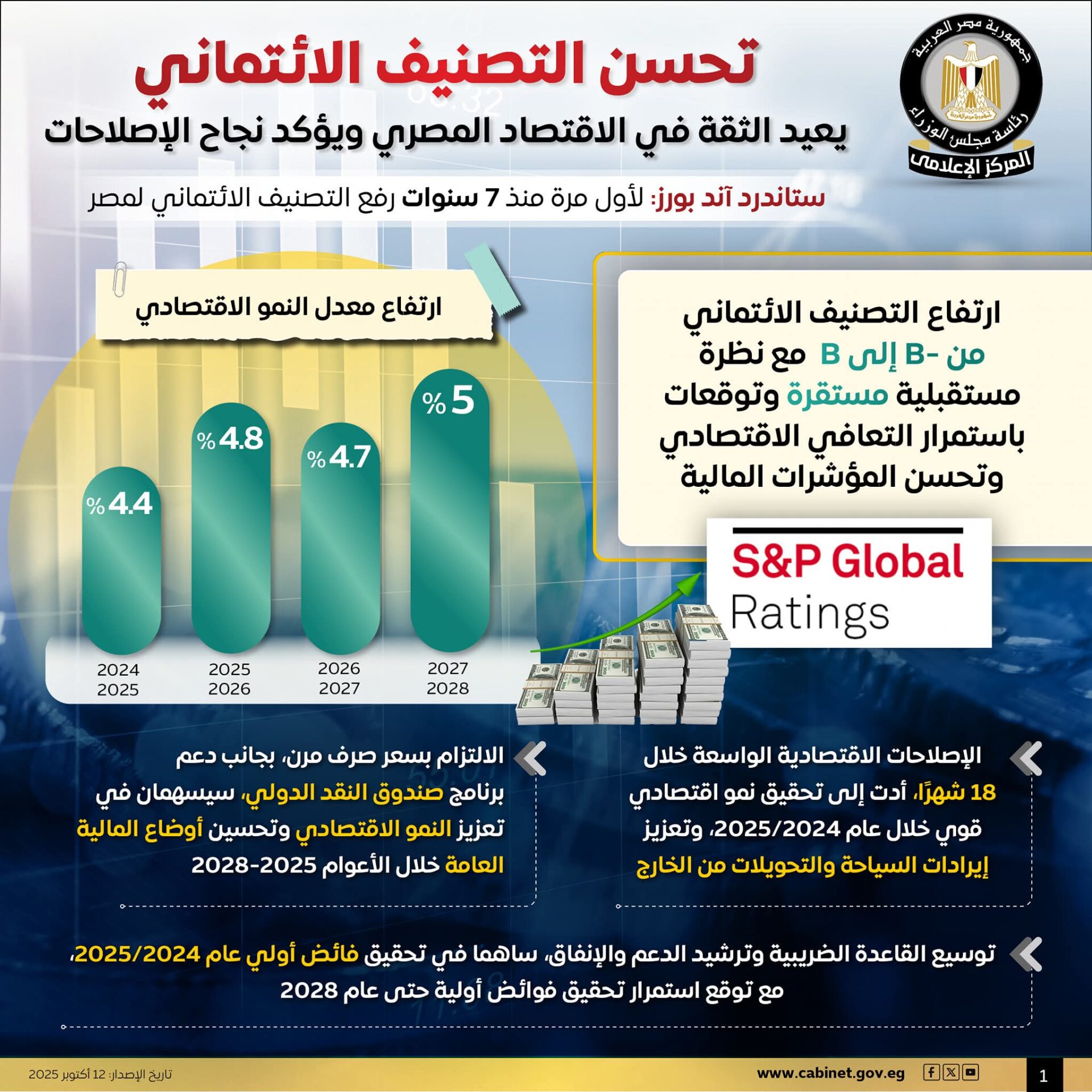 نشر المركز الإعلامي لمجلس الوزراء عددًا من الإنفوجرافات عبر منصاته على مواقع التواصل الاجتماعي، سلط من خلالها الضوء على تحسن التصنيف الائتماني للاقتصاد المصري، بما يعكس نجاح الإصلاحات الاقتصادية التي تنتهجها الدولة.