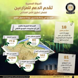 وعلى صعيد المساحة المنزرعة بالقمح في أبرز مشروعات التوسع الأفقي، فقد تم زراعة 322 ألف فدان قمح بمشروع توشكى الخير، وكذلك زراعة 203 آلاف فدان قمح بمشروع شرق العوينات، إلى جانب زراعة 80 ألف فدان قمح بمشروع مستقبل مصر “باكورة مشروعات الدلتا الجديدة”، بالإضافة إلى زراعة 77.8 ألف فدان قمح بمشروع الفرافرة، وزراعة 4284 فدان قمح بمشروع عين دالة، في حين تم زيادة عدد الصوامع لـ 81 صومعة عام 2025 مقابل 35 صومعة عام 2014.