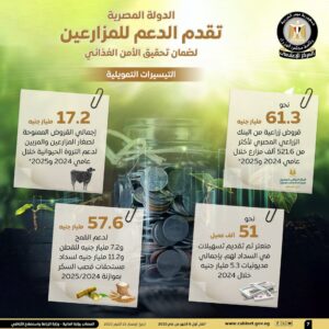 وفي سياق متصل، استعرضت الإنفوجرافات جهود الدولة في دعم التمويل والمدخلات الزراعية، حيث تتحمل الدولة أكثر من 70 مليار جنيه سنويًا، لتوفير الأسمدة للمزارعين بأسعار مناسبة، مع التنسيق مع مختلف مصانع الأسمدة لتوريد 55% من إنتاجها لحساب صغار المزارعين، مع صرف 23.5 مليون شيكارة سماد مدعم وفقًا لمنظومة “كارت الفلاح”، تعادل 1.175 مليون طن خلال الموسم الصيفي لعام 2025.