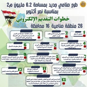 قبل يومين من إغلاق باب التقديم، جددت وزارة الصناعة الدعوة للمستثمرين للتقدم على الطرح الثاني عشر للأراضي الصناعية المرفقة لعدد 1128 قطعة أرض بإجمالي مساحة 6.2 مليون متر مربع موزعة على 26 منطقة ومدينة صناعية في 16 محافظة، حيث تتراوح مساحة الأراضي من 190 متر مربع إلى 500 ألف متر مربع لتناسب مختلف الأنشطة الصناعية، وذلك وفقًا للميزة النسبية لكل محافظة ويستمر التقديم على الطرح حتى يوم 6 نوفمبر 2025، عبر منصة مصر الصناعية الرقمية madein.eg على أن يتم إعلان نتائج التخصيص يوم 24 نوفمبر 2025.