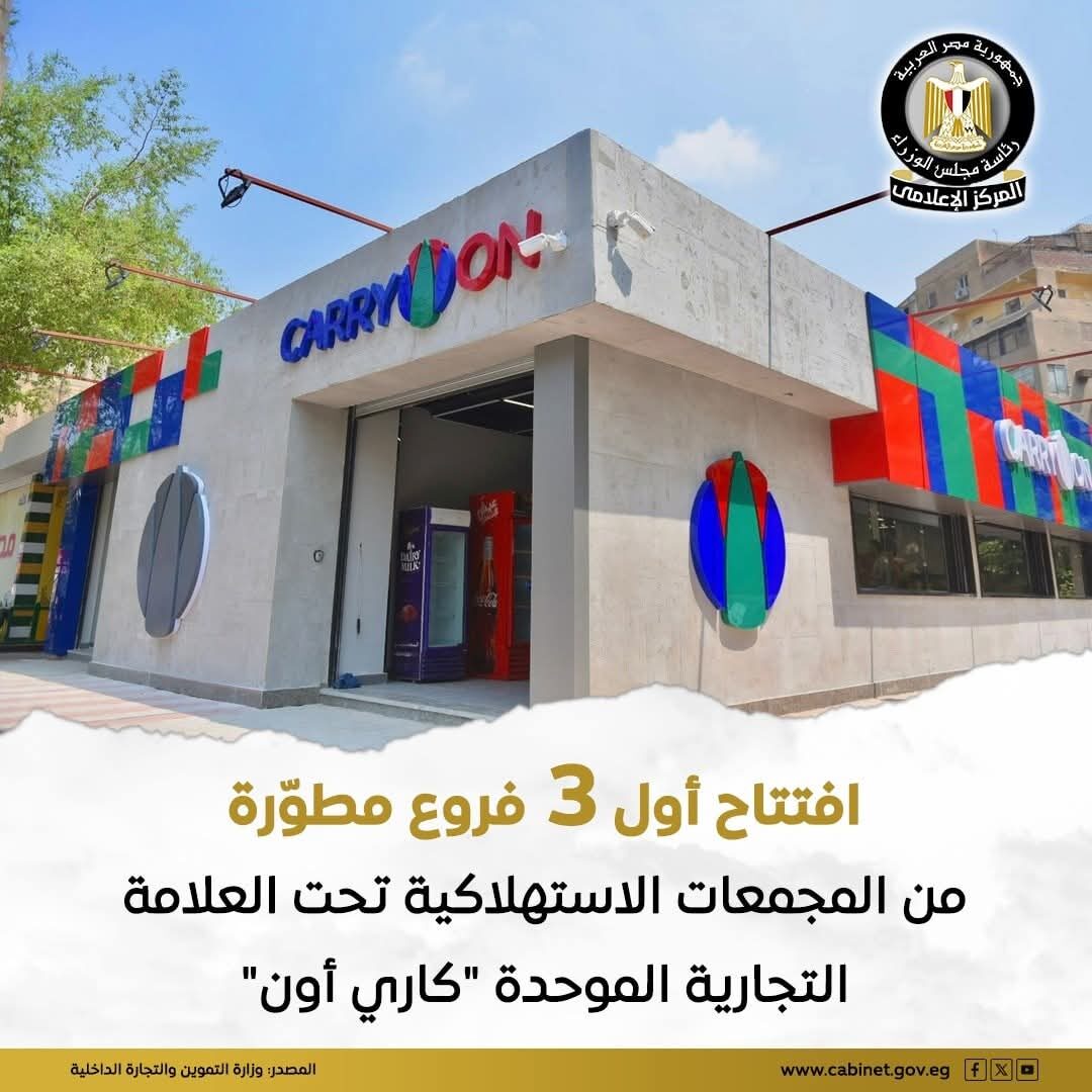 اطلقت وزارة التموين والتجارة الداخلية، 3 منافذ لمشروع “Carry On – كاري أون” لتطوير منافذ التجزئة الحكومية وتوحيد الهوية التجارية لجميع الفروع التابعة لها، بما في ذلك المجمعات الاستهلاكية ومنافذ مشروع جمعيتي والبدالين التموينيين.
