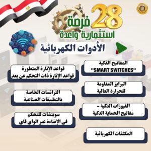 17- الأدوات الكهربائية (المفاتيح الذكية “Smart Switches”- قواعد الإنارة المتطورة مثل قواعد الإنارة ذات التحكم عن بعد- البرايز المقاومة للحرارة العالية- الترانسات الخاصة بالتطبيقات الصناعية- الفيوزات الذكية- سويتشات للتحكم في الإضاءة عبر الواي فاي- مفاتيح الحماية الذكية- المكثفات الكهربائية)