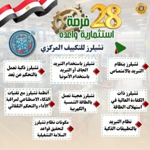 19- تشيلرز للتكييف المركزي (تشيلرز بنظام التبريد بالامتصاص – تشيلرز باستخدام التبريد الجاف أو التبريد باستخدام الأمونيا – تشيلرز ذكية تعمل بالتحكم عن بُعد- تشيلرز ذات الكفاءة العالية في استهلاك الطاقة- تشيلرز هجينة تعمل بالطاقة الشمسية والكهربية- أنظمة تشيلرز مع تقنيات الذكاء الاصطناعي لمراقبة الأداء والتحكم التلقائي)، ونظام التبريد بالتطبيقات الذكية، ومكونات نظام تشيلرز لتحقيق قواعد السلامة التشغيلية.