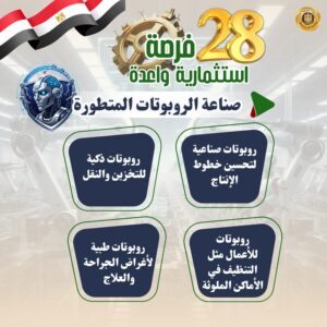 22- صناعة الروبوتات المتطورة (روبوتات صناعية لتحسين خطوط الإنتاج- روبوتات طبية لأغراض الجراحة والعلاج- روبوتات ذكية للتخزين والنقل – روبوتات للأعمال مثل التنظيف في الأماكن الملوثة)