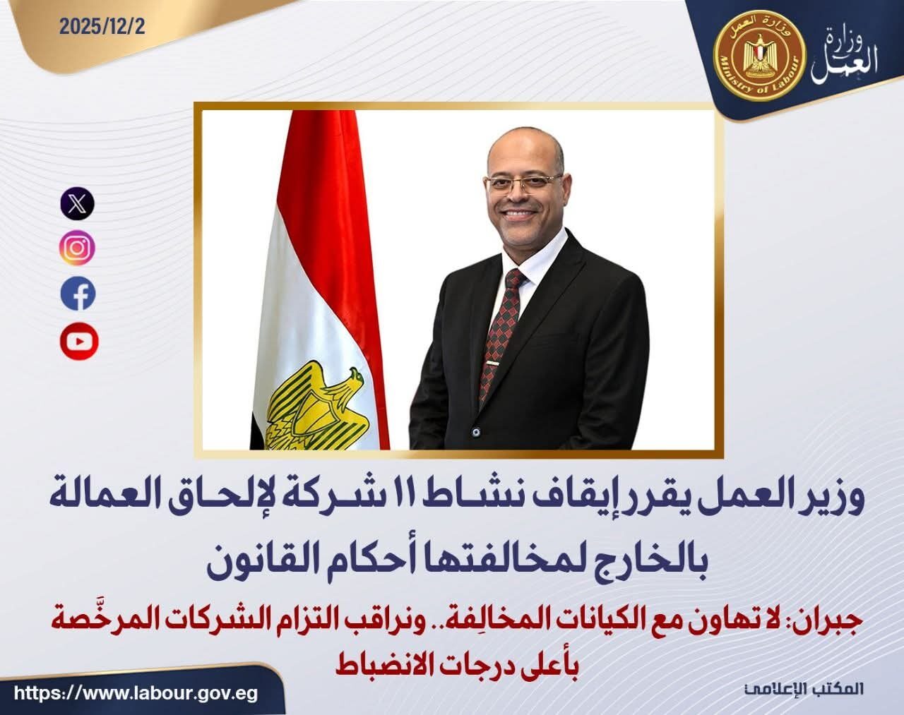 وتشمل قائمة الشركات التي تم إيقافها:الحلال (ترخيص 372)، مصر كناري (1470)، البدوي (638)، منارة الخليج (1030)، المعقب العربي (722)، أسياد (1335)، عبد الرازق (357)، الغامدي (728)، أبو غازي (150)، لايت (928)، العدالة (288)…وفي هذا السياق، صرّح وزير العمل السيد محمد جبران قائلاً:”لن نتهاون مع أي شركة تخالف الضوابط المنظمة لنشاط إلحاق العمالة بالخارج، فحقوق المواطنين خط أحمر. ونعمل على ضمان سوق تشغيل منظم وآمن يحمي العمالة المصرية ويعزز الثقة في منظومة التشغيل الخارجي. وستستمر الوزارة في حملاتها الرقابية واتخاذ الإجراءات القانونية الحاسمة ضد أي جهة تعمل خارج إطار القانون.”