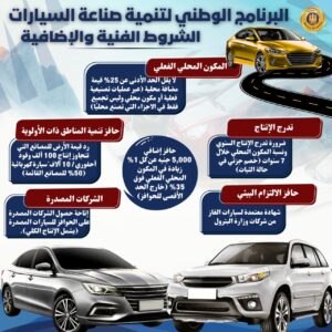 • إنتاج سنوي لا يقل عن 10 آلاف سيارة في إطار البرنامج وعلى أن يكون الحد الأدنى لإنتاج الموديل الواحد 5 آلاف سيارة تزداد سنوياً بنسبة مكون صناعي محلي مستهدف لا تقل عن 20% في بداية البرنامج للسيارات ذات الوقود الأحفوري وتصل إلى 35% بنهاية البرنامج.