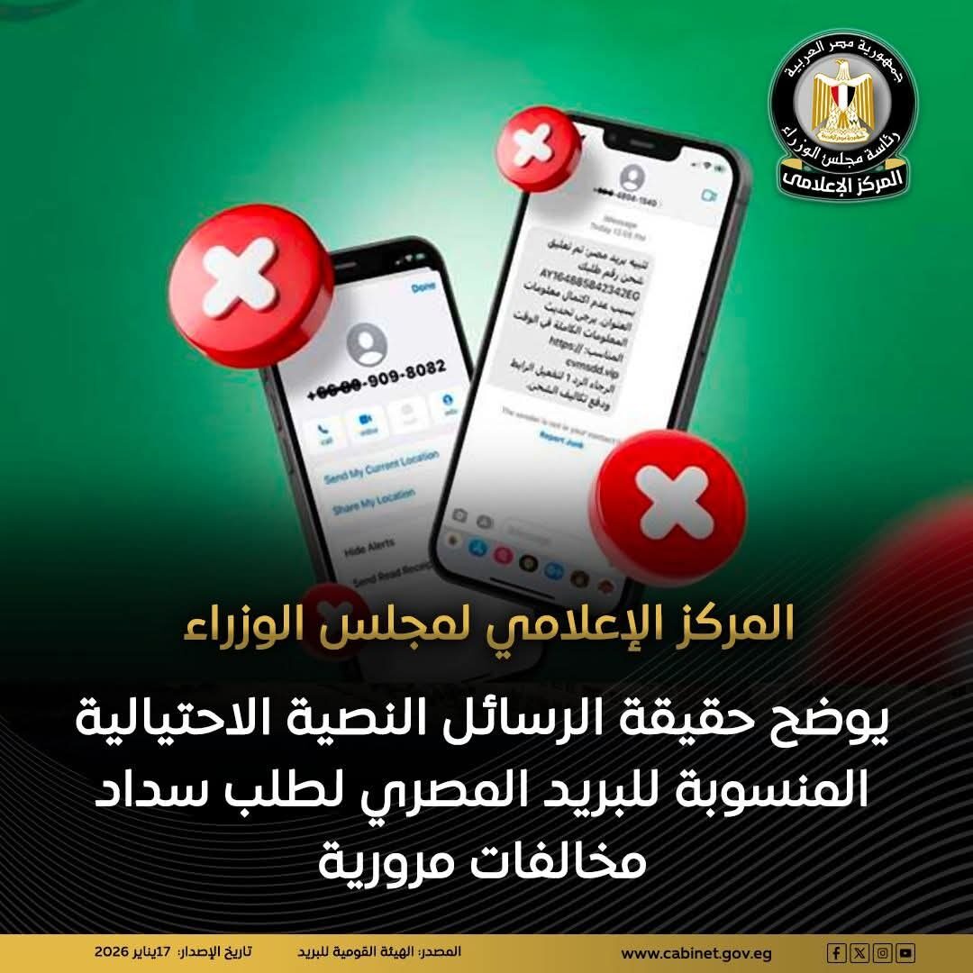 نشر المركز الإعلامي لمجلس الوزراء بيانًا عبر منصاته على مواقع التواصل الاجتماعي، أوضح من خلاله حقيقة الرسائل النصية الاحتيالية المنسوبة للبريد المصري والتي تطالب بسداد مخالفات مرورية.