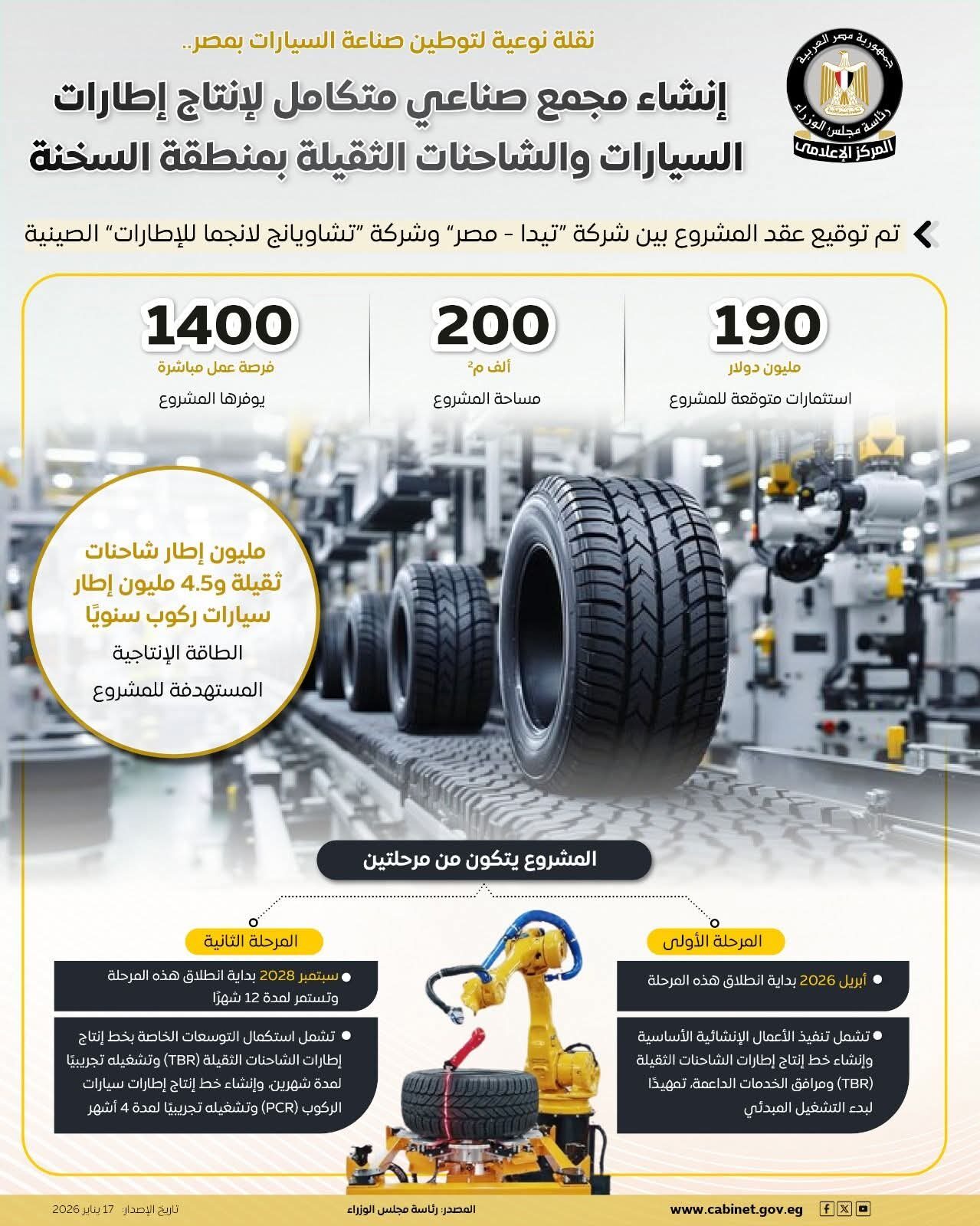 في خطوة استراتيجية تعكس حرص الدولة على توطين صناعة السيارات، تم توقيع عقد إنشاء مجمع صناعي متكامل لإنتاج إطارات السيارات والشاحنات الثقيلة بمنطقة السخنة، باستثمارات تصل إلى 190 مليون دولار، بما يؤسس لمرحلة جديدة من الاكتفاء الذاتي والتصدير.