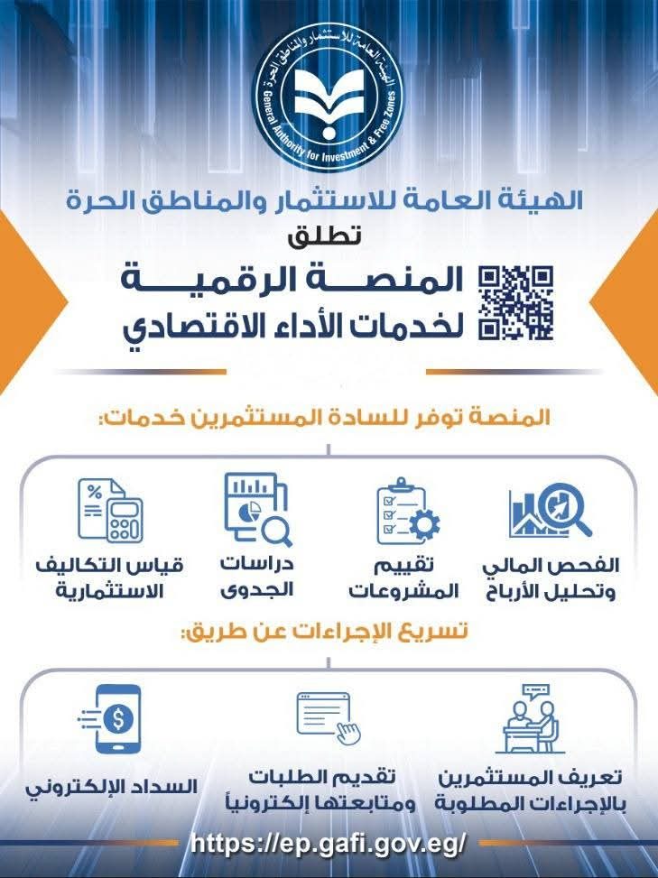 في إطار توجه الدولة نحو التحول الرقمي وتطوير البنية المعلوماتية للخدمات الاستثمارية، تعلن الهيئة العامة للاستثمار والمناطق الحرة عن إطلاق المنصة الرقمية لخدمات قطاع الأداء الاقتصادي، وذلك كمنصة موحدة لتقديم الخدمات الفنية المتخصصة للمستثمرين.