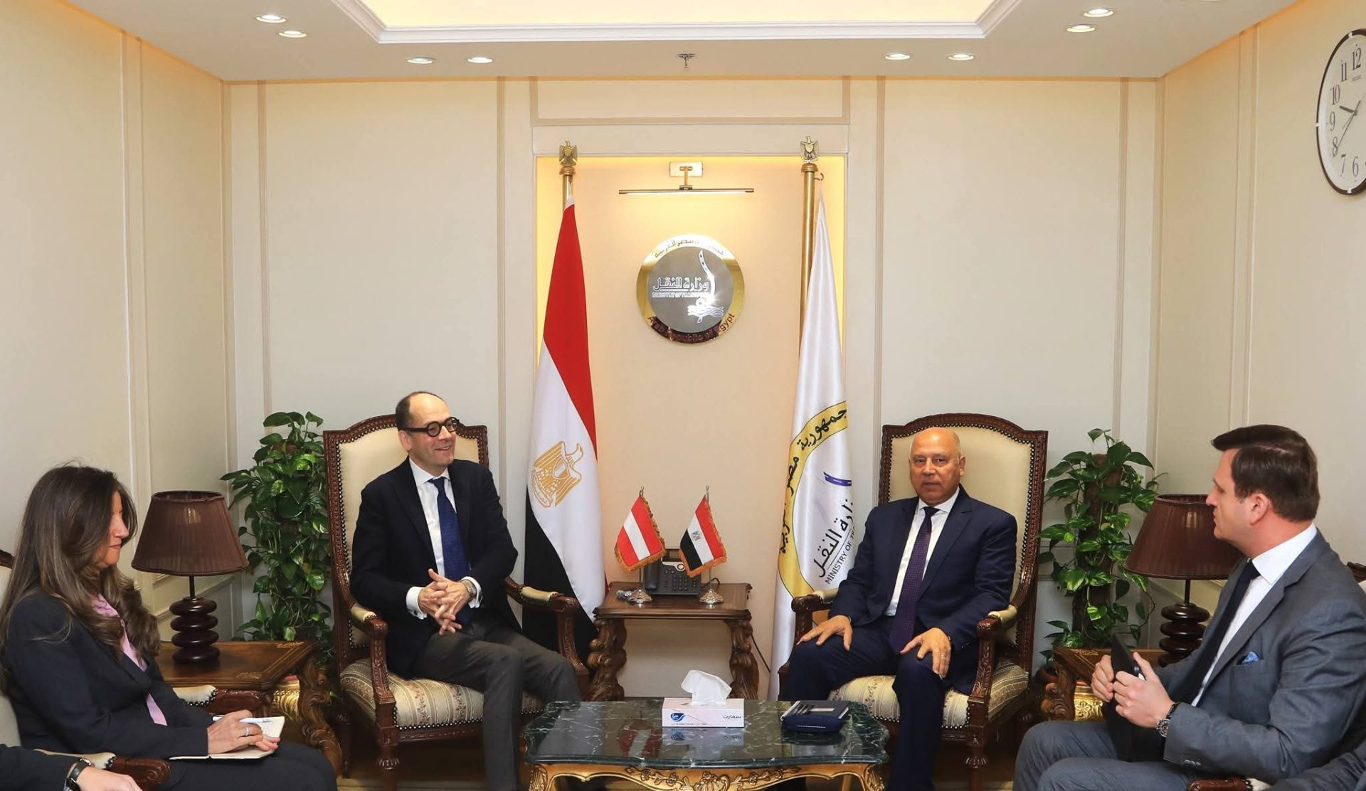 إلتقى الفريق مهندس كامل الوزير – وزير النقل ماكس تريور، الرئيس التنفيذي لشركة بلاسر النمساوية و السفير “جورج بوستينجر” سفير النمسا بالقاهرة ، وذلك لمناقشة قيام الشركة بإنشاء مركز إقليمي لصيانة ماكينات تجديدات السكة وإنتاج قطع غيار تلك الماكينات بالإضافة الى إجراء عمرات ماكينات السكك الحديدية وحضر اللقاء المهندس وجدي رضوان نائب الوزير للجر الكهربائي والسكك الحديدية والمهندس محمد عامر رئيس هيئة السكك الحديدية
