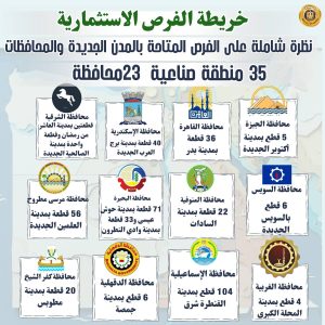 – جاء توزيع الأراضي المطروحة كالتالي: 5 قطع بمدينة أكتوبر الجديدة بمحافظة الجيزة، و36 قطعة بمدينة بدر بمحافظة القاهرة، و40 قطعة بمدينة برج العرب الجديدة بمحافظة الإسكندرية، وقطعتين بمدينة العاشر من رمضان وقطعة واحدة بمدينة الصالحية الجديدة بمحافظة الشرقية، و6 قطع بمدينة السويس الجديدة بمحافظة السويس، و22 قطعة بمدينة السادات بمحافظة المنوفية، و71 قطعة بمدينة حوش عيسى و33 قطعة بمدينة وادي النطرون بمحافظة البحيرة، و56 قطعة بمدينة العلمين الجديدة بمحافظة مرسى مطروح، و6 قطع بمدينة جمصة بمحافظة الدقهلية، و104 قطع بمدينة القنطرة شرق بمحافظة الإسماعيلية، و4 قطع بمدينة المحلة الكبرى بمحافظة الغربية، و20 قطعة بمدينة مطوبس بمحافظة كفر الشيخ، و11 قطعة بامتداد جنوب الرسوة وقطعتين بجنوب بورسعيد بمحافظة بورسعيد، و52 قطعة بمدينة بئر العبد بمحافظة شمال سيناء، وقطعتين بمدينة بني سويف الجديدة بمحافظة بني سويف، و53 قطعة بمدينة الفيوم الجديدة و7 قطع بمدينة كوم أوشيم بمحافظة الفيوم، و3 قطع بمدينة المطاهرة بمحافظة المنيا، و4 قطع بمدينة دشلوط و80 قطعة بمدينة أسيوط الجديدة بمحافظة أسيوط، و159 قطعة بمدينة أخميم الجديدة و5 قطع بمدينة الكوثر و8 قطع بمدينة غرب جرجا و10 قطع بمدينة غرب طهطا بمحافظة سوهاج، و196 قطعة بمدينة نجع حمادي و109 قطع بمدينة قفط بمحافظة قنا، و6 قطع بمدينة البغدادي و119 قطعة بمدينة طيبة الجديدة بمحافظة الأقصر، و35 قطعة بمدينة توشكى الجديدة و3 قطع بمنطقة العلاقي وقطعة واحدة بمدينة كوم أمبو بمحافظة أسوان، وقطعة واحدة بمدينة الداخلة بمحافظة الوادي الجديد.