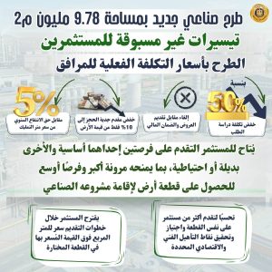 1. الطرح يشمل 1272 قطعة أرض صناعية بإجمالي مساحة 9.78 مليون متر مربع في 23 محافظة