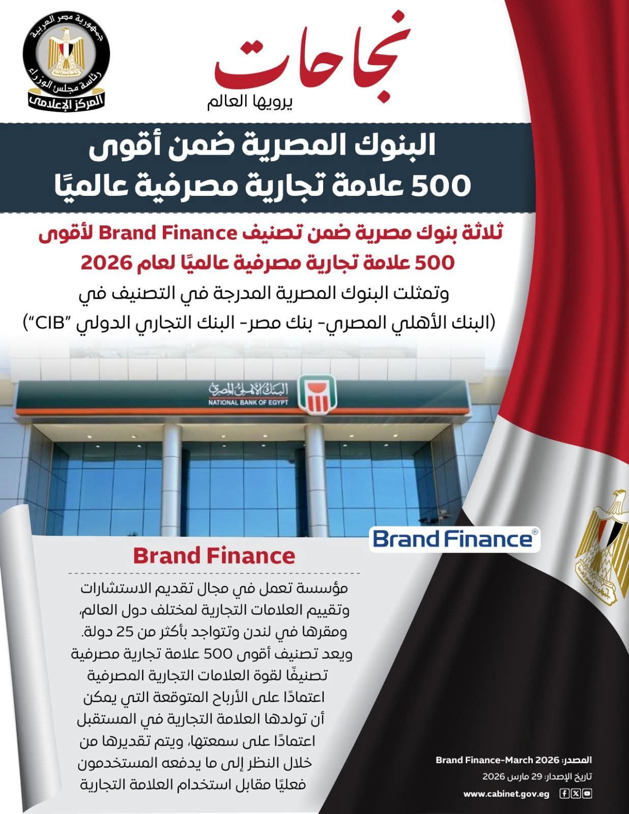 إنجاز جديد يرسّخ مكانة القطاع المصرفي المصري على الساحة العالمية، فقد أظهر تصنيف أقوى 500 علامة تجارية مصرفية لعام 2026 الصادر عن Brand Finance وجود ثلاثة بنوك مصرية ضمن القائمة، وهي البنك الأهلي المصري، بنك مصر، والبنك التجاري الدولي CIB، في مؤشر واضح على قوة الأداء وثقة العملاء. ويعتمد التصنيف على تقييم القيمة المستقبلية للأرباح المرتبطة بالعلامة التجارية، ما يعكس تطور القطاع المصرفي المصري وقدرته على المنافسة عالميًا.