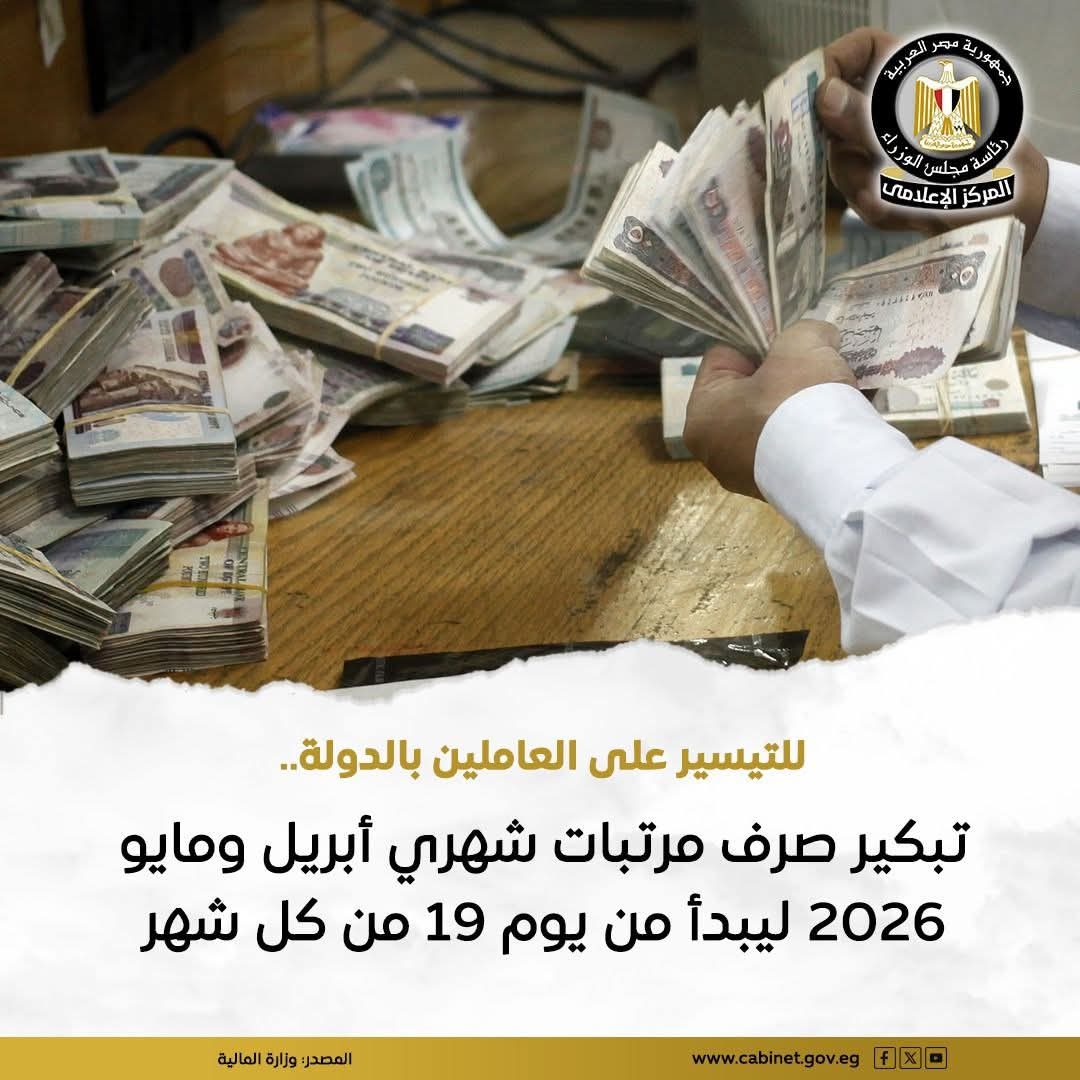 📍 قررت وزارة المالية، تقديم مواعيد صرف متأخرات مستحقات العاملين بالدولة عن شهر مارس الحالي لتبدأ ٧ أبريل المقبل مراعاة لأعياد الأخوة المسيحيين، كما قررت الوزارة بدء صرف مرتبات أبريل ومايو ٢٠٢٦ يوم ١٩ من كل شهر للتيسير على المواطنين، وتعزيز قدرتهم على تلبية الاحتياجات الأساسية.