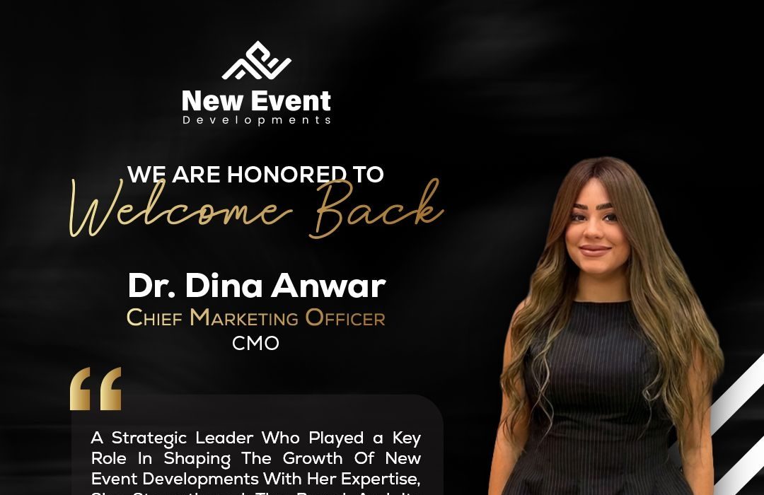 من جانبها قالت الدكتورة دينا أنور، رئيس قطاع التسويق بشركة نيو إيفنت للتطوير العقاري: “سعيدة بانضمامي مرة أخرى لفريق عمل شركة نيو إيفنت للتطوير العقاري، وسنسعى جميعًا لتحقيق خطة الشركة التسويقية والتكامل مع باقي القطاعات الأخرى لتحقيق الأهداف الاستراتيجية للشركة وتعزيز ريادتها بالسوق المصري”.