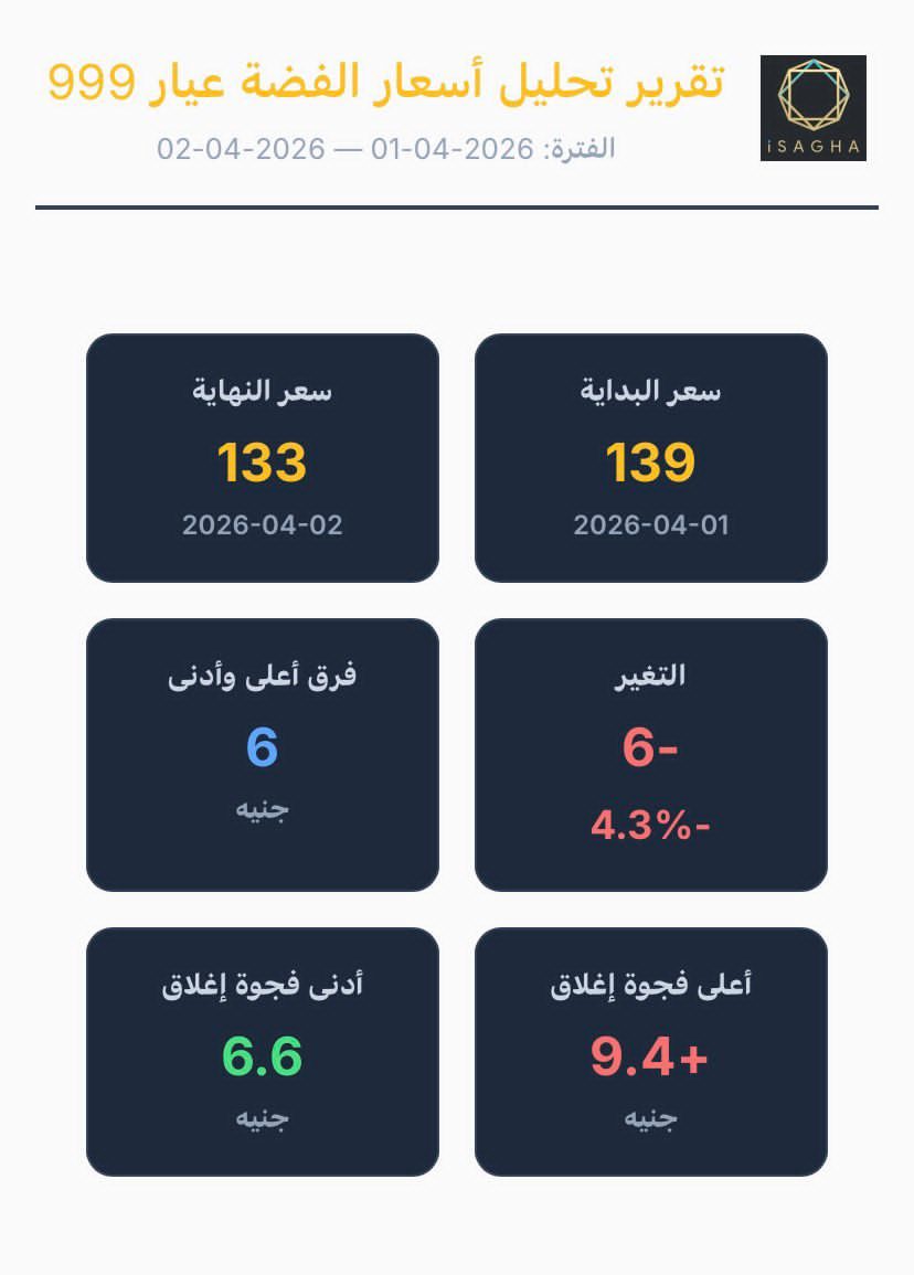 أشارت “آي صاغة” إلى أن الفجوة بين السعر المحلي والسعر العالمي تراجعت بشكل ملحوظ، حيث انخفضت من 9.37 جنيه (7.23%) في 1 أبريل إلى 7.63 جنيه (6.09%) في 2 أبريل، وهو ما يعكس تحرك السوق المحلي نحو مستويات أكثر توازناً، خاصة بعد الموجة المضاربية التي شهدتها الفضة في يناير 2026.